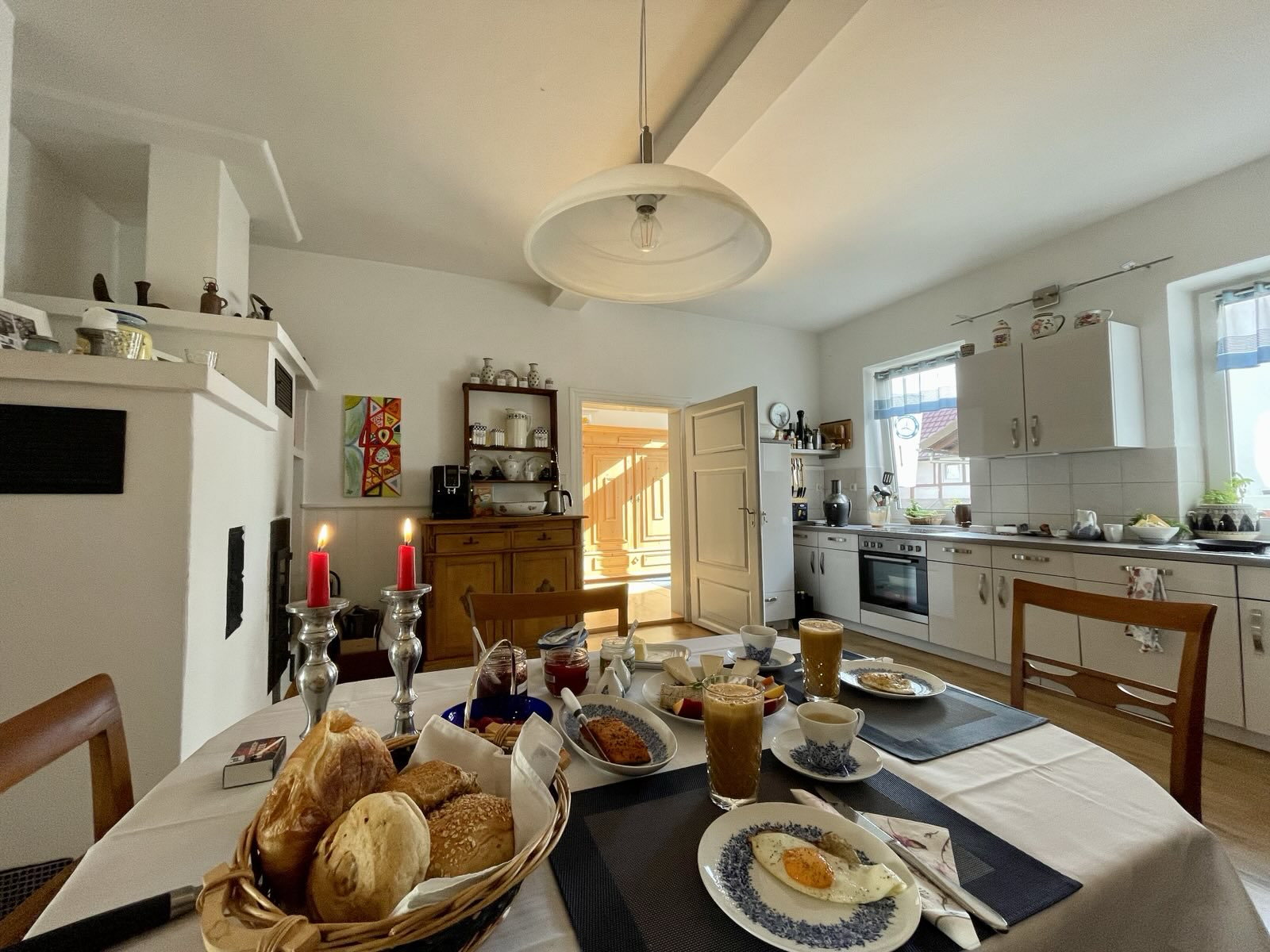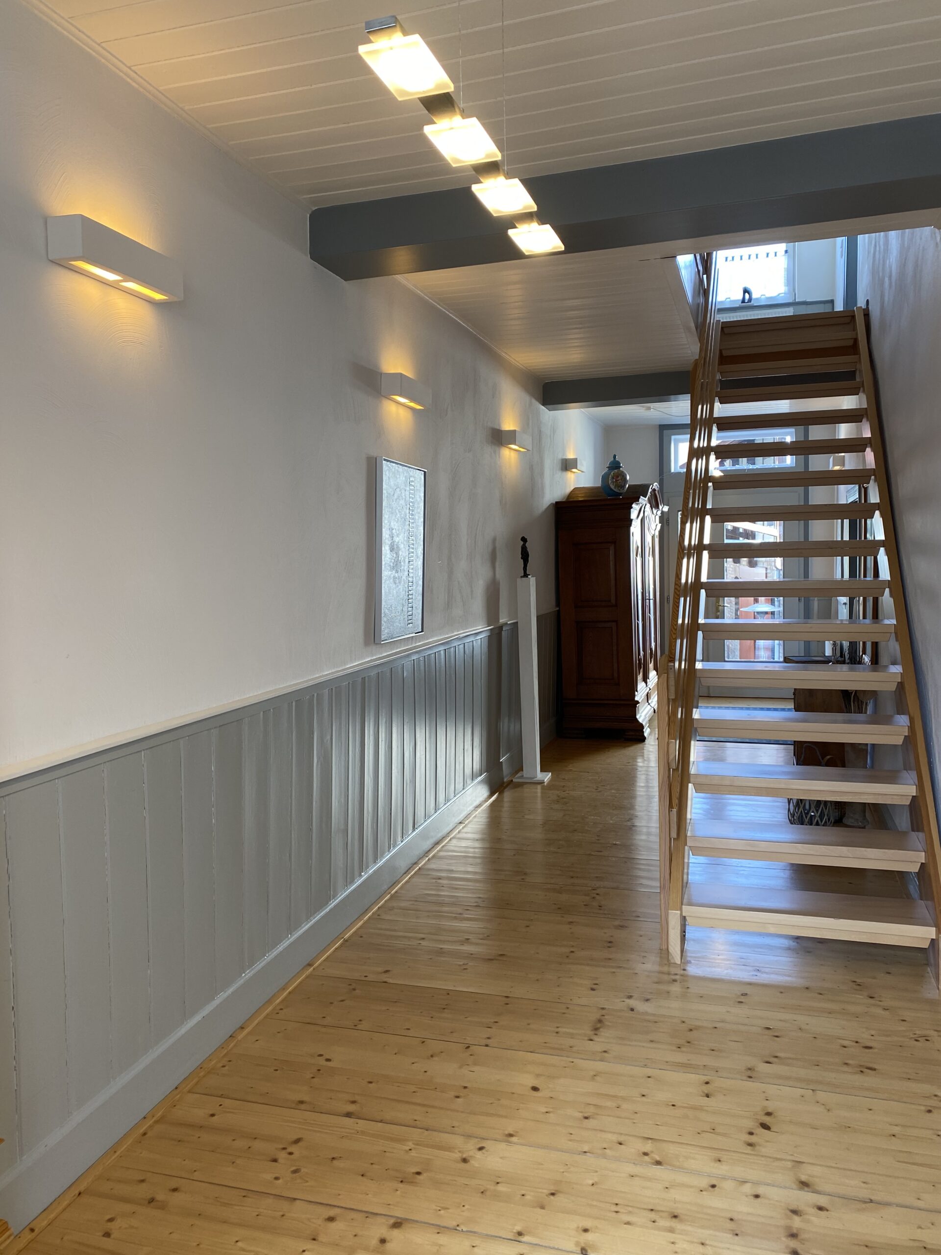 Durch den hellen und großzügigen Flur gelangst Du in die gemütliche und bestens ausgestattete Wohnküche mit Kaminofen sowie in den Salon im Stil des Biedermeier. Selbstverständlich gibt es im Erdgeschoß noch ein Gäste WC.